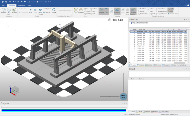 At this stage, however, we were only addressing machine collisions and gouges of the tool and spindle against the target workpiece geometry. While we could guarantee that the target part wouldn’t be damaged by the tool and no machine collisions would occur, we lacked material removal simulation, meaning unexpected cuts into unmachined stock went undetected, such as a rapid motion crossing the stock. This required material removal simulation, so we directed users to run the integrated material removal simulation engine within their CAM software, typically licensed from specialist companies providing such technology.