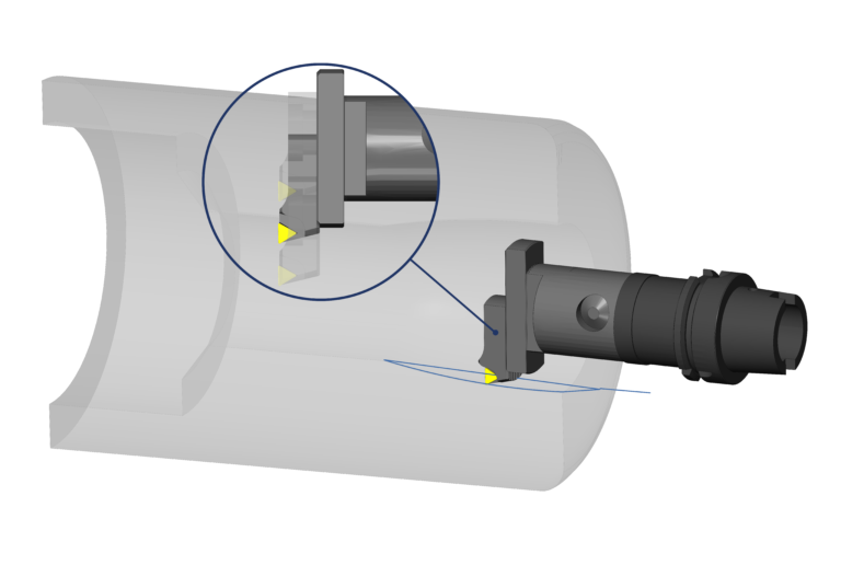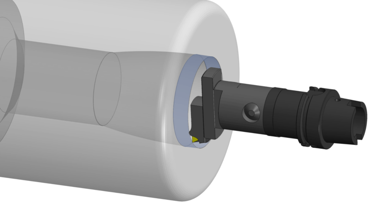 The ModuleWorks MultiXPost post processor now supports U-Axis turning systems, also known as facing head or facing slide kinematics. The input is a turning toolpath. Markers on the toolpath indicate when to engage the special translation axis. This creates an operation where the machine first travels above the workpiece and then, using the U-Axis instead of the other translation axis, cuts the desired shape in turning mode.