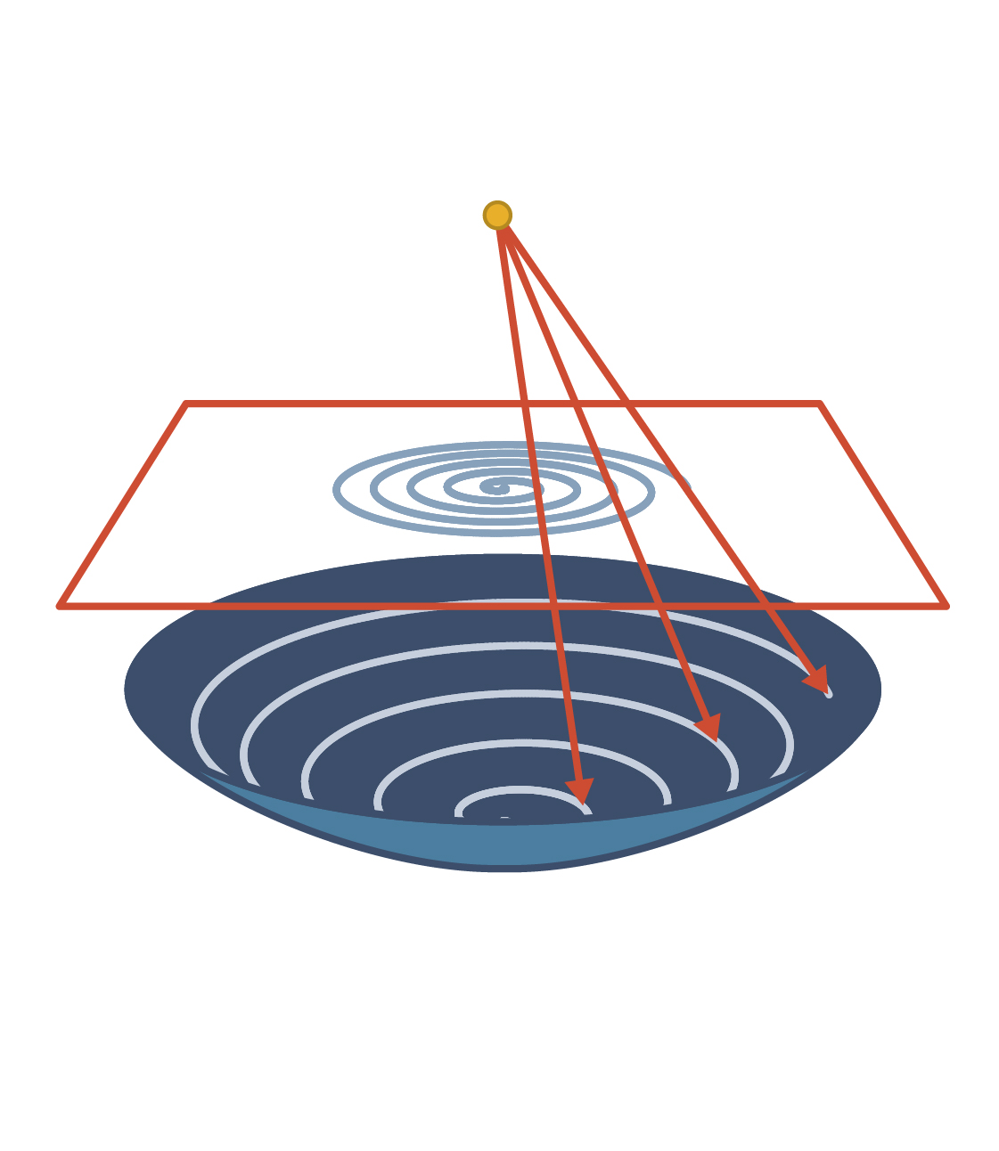 - Point Projection: The toolpath pattern is generated on a plane which is parallel to the xy-plane at a specified height and then projected towards (or away) from a point on the z-axis at a given height. Its preferred application is, for example, for strongly curved lens surfaces which are not completely covered by Z-axis projection. Point projection can also be combined with the spiral morph pattern to manufacture asymmetric molds such as D-segments.