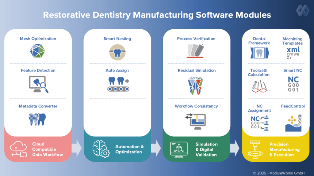 At this year’s IDS (25 – 29 March) in Cologne, ModuleWorks is showcasing a new range of smart solutions that address these challenges. By harnessing the power of AI and cloud technology, ModuleWorks Dental CAM modules streamline data preparation, reduce manual steps and minimize iterations, enhancing the efficiency and quality of manufacturing in restorative dentistry, orthodontics and implantology.