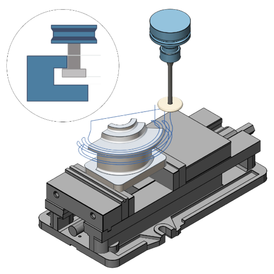 Additional toolpath slices are generated on the flat regions of the undercut. The toolpath calculation algorithms use “out to in” ordering to remove the material gradually which enables the flatland cycle to machine parts with undercut features.