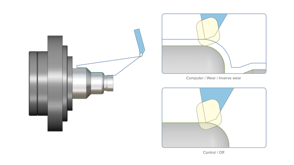 • Wear / Inverse Wear: Compensation is performed automatically during the toolpath calculation and G40/41/42 commands are added to the post-processed output. This allows machine operators to adjust the compensated toolpath according to tool wear.