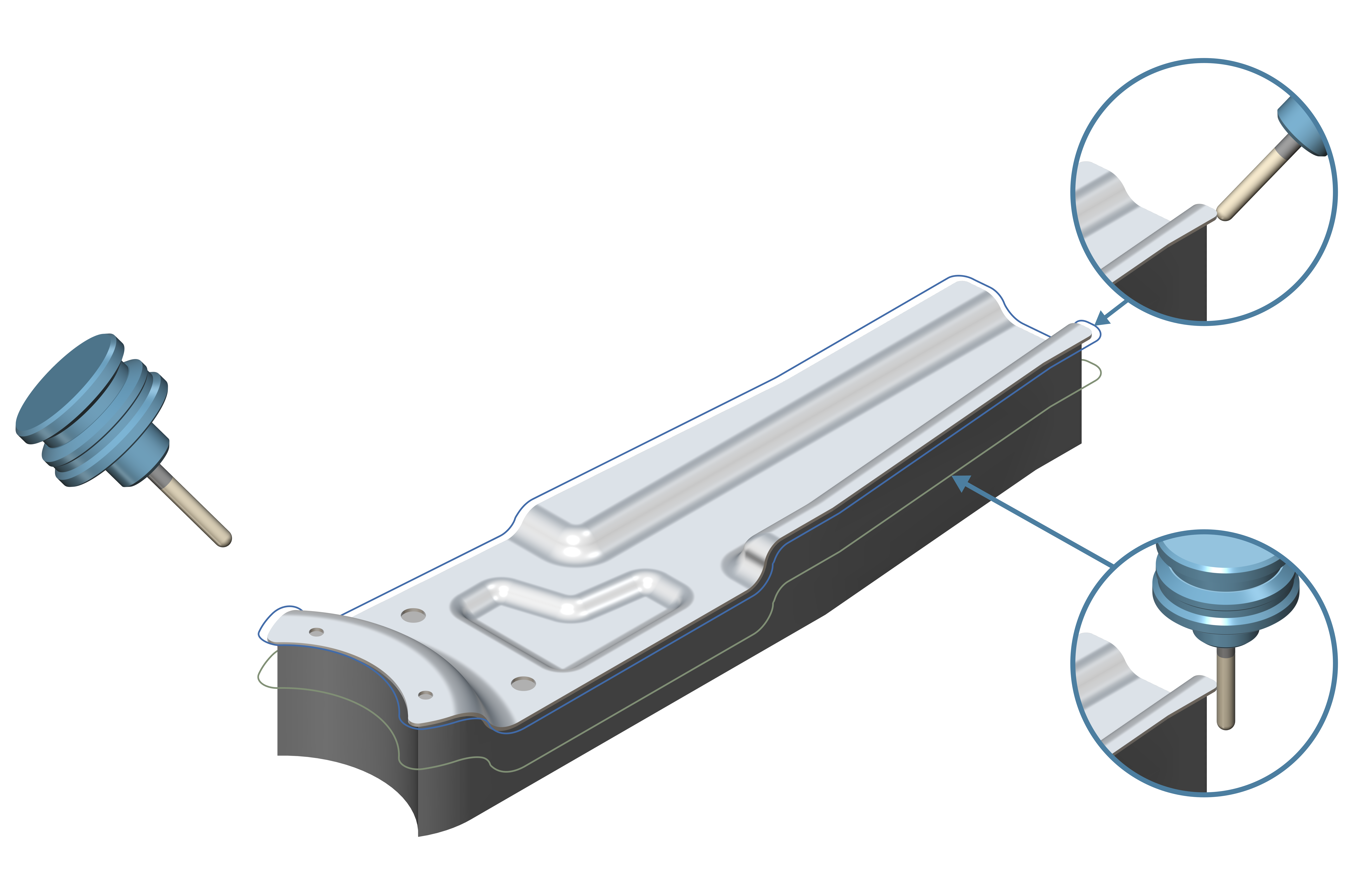 For wireframe 5-axis machining with sphere mills, users can now define which part of the tool is in contact with the drive curve. For example, cutting with the cylindrical part of the flute enables the tool to withstand greater forces and may be more suitable for cutting through certain materials. It can also help to prolong tool life. Cutting with the cylinder can also allow faster cutting speeds for applications that do not require high precision. When high levels of accuracy are needed, users can choose to cut with the tip of the tool.