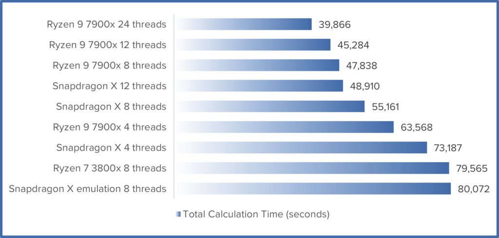 The results show that CAM vendors can expect the ModuleWorks native ARM software to deliver a processing performance similar to the x86 version, especially on 12 threads. Although not as fast as the x86 version, the performance is high for a laptop.
