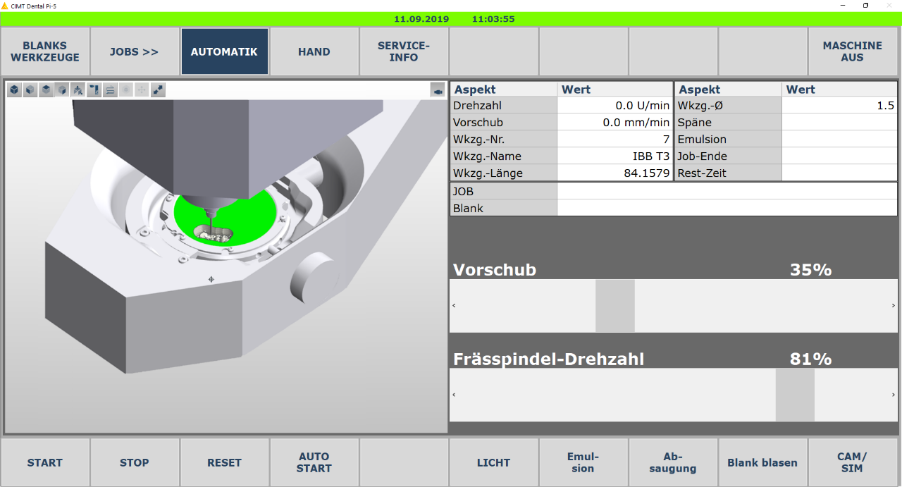 Tightly integrated in the MTX, the ModuleWorks simulation technology has direct access to the real axis positions, machine geometries and workpiece position and uses the same motion data as the real servos to deliver a highly accurate real-time simulation of the entire machine kinematics. CIMT operators benefit from a detailed and unobscured visualization of the whole dental machining process from every angle in real-time. The simulation also offers visual aids such as a deviation analysis to highlight the rest material after machining.