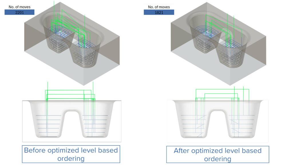 Challenge: Currently, ModuleWorks follows strict level based ordering for parts with multiple pockets on regions. This can result in unnecessary retracts and increased machining time.