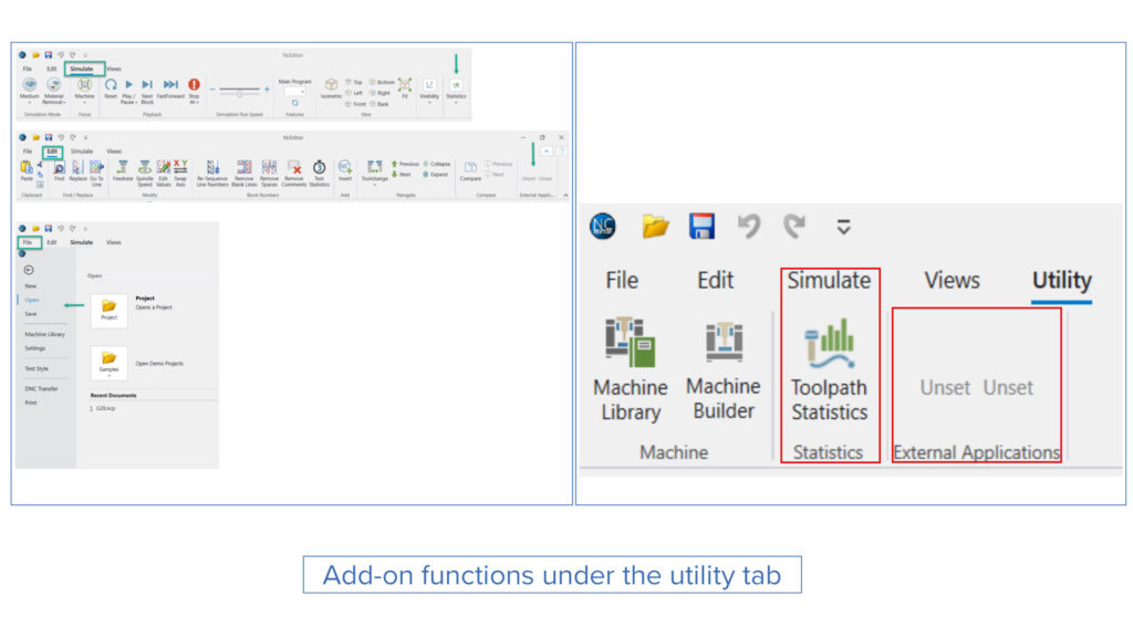 Solution: Now, all the add-on functions are located on the Utility tab of the NC Editor interface.