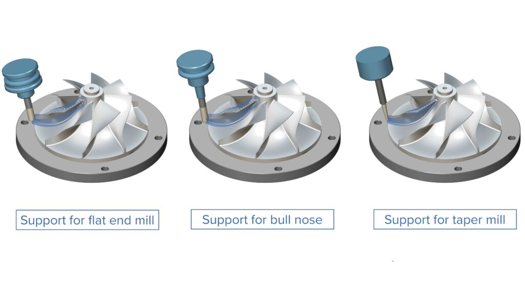 Solution: It is now possible to use bull nose mills, end mills, and all types of taper tools for blade finishing.