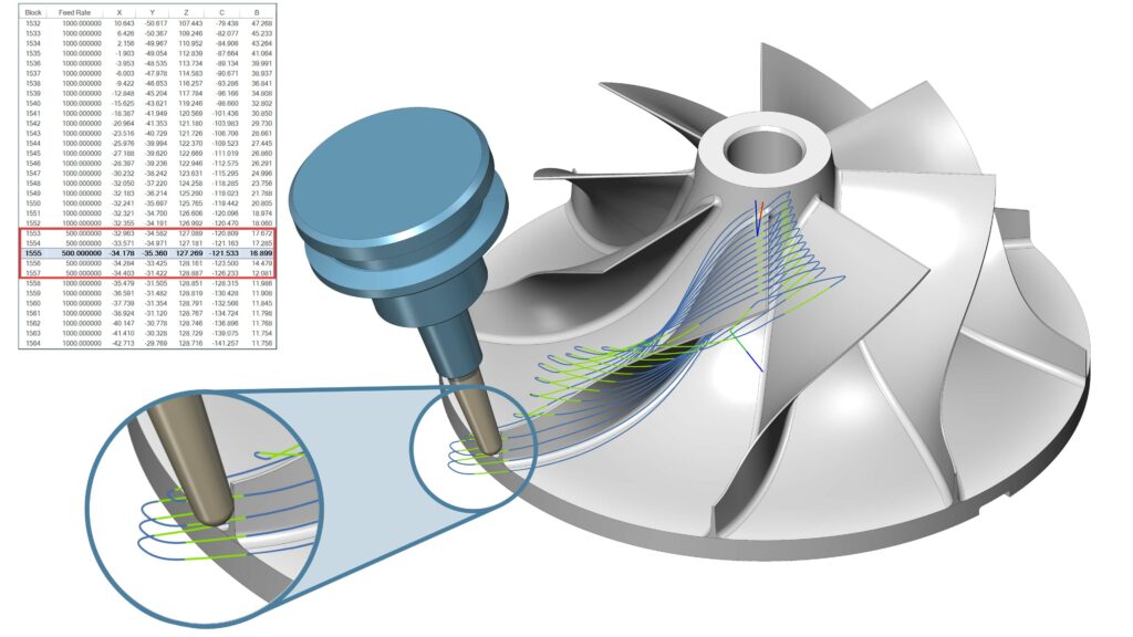 Challenge: Multiblade finishing is currently only possible with ball end mills and barrel mills when machining blisks. This limits users and prevents them from using standard tools such as flat end mills and bull nose mills.