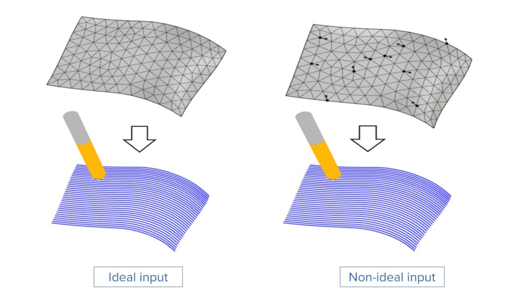 Challenge: Small changes in the meshes (new triangulation, different mesh offset, different mesh patching), can significantly affect the machining paths.
