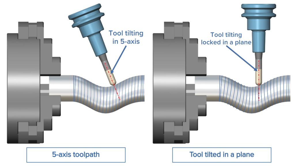 Solution: A new tilting strategy has been added. The tool axis can now be tilted in the plane defined by the normal to a user-selected direction. The tool axis is projected on the selected plane on each toolpath point. If the plane normal is aligned with one of the machine’s rotational axes, it will limit rotational machine movements to that axis.